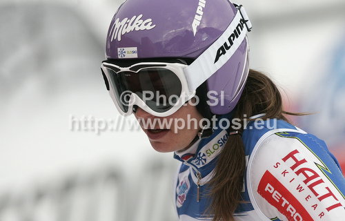 : Tina Maze of Slovenia reacts in finish of first run of women giant slalom race of Audi FIS Alpine skiing World cup in Kranjska Gora, Slovenia. Traditional Golden fox trophy women giant slalom race of Audi FIS Alpine skiing World cup, which was scheduled to be run in Maribor, Slovenia, was moved to Kranjska Gora, Slovenia, due warm weather and lack of snow in Maribor, and was held in Kranjska Gora, Slovenia, on Saturday, 21st of January 2012.