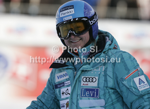 : Tanja Poutiainen of Finland after inspection of second run of women giant slalom race of Audi FIS Alpine skiing World cup in Kranjska Gora, Slovenia. Traditional Golden fox trophy women giant slalom race of Audi FIS Alpine skiing World cup, which was scheduled to be run in Maribor, Slovenia, was moved to Kranjska Gora, Slovenia, due warm weather and lack of snow in Maribor, and was held in Kranjska Gora, Slovenia, on Saturday, 21st of January 2012.