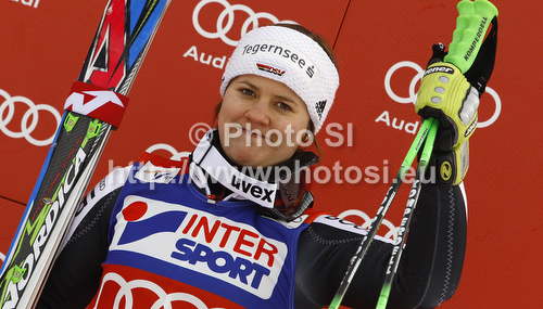 : Third placed Viktoria Rebensburg of Germany celebrates her medal won in women giant slalom race of Audi FIS Alpine skiing World cup in Kranjska Gora, Slovenia. Traditional Golden fox trophy women giant slalom race of Audi FIS Alpine skiing World cup, which was scheduled to be run in Maribor, Slovenia, was moved to Kranjska Gora, Slovenia, due warm weather and lack of snow in Maribor, and was held in Kranjska Gora, Slovenia, on Saturday, 21st of January 2012.