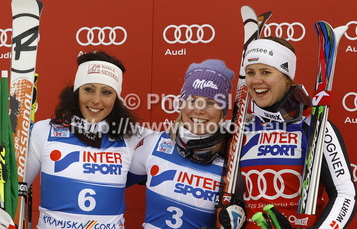 : Winner Tessa Worley of France (M), second placed Federica Brignone of Italy (L) and third placed Viktoria Rebensburg of Germany (R) celebrate their medals won in women giant slalom race of Audi FIS Alpine skiing World cup in Kranjska Gora, Slovenia. Traditional Golden fox trophy women giant slalom race of Audi FIS Alpine skiing World cup, which was scheduled to be run in Maribor, Slovenia, was moved to Kranjska Gora, Slovenia, due warm weather and lack of snow in Maribor, and was held in Kranjska Gora, Slovenia, on Saturday, 21st of January 2012.