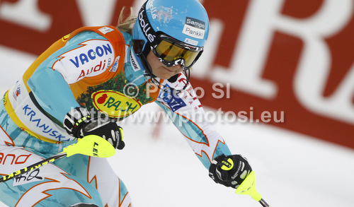 Kranjska Gora ,Slovenia - 22.01.2012 : Tanja Poutiainen of Finland skiing in first run of women slalom race of Audi FIS Alpine skiing World cup in Kranjska Gora, Slovenia. Traditional Golden fox trophy women slalom race of Audi FIS Alpine skiing World cup, which was scheduled to be run in Maribor, Slovenia, was moved to Kranjska Gora, Slovenia, due warm weather and lack of snow in Maribor, and was held in Kranjska Gora, Slovenia, on Sunday, 22nd of January 2012. Photo by: Primoz Jeroncic