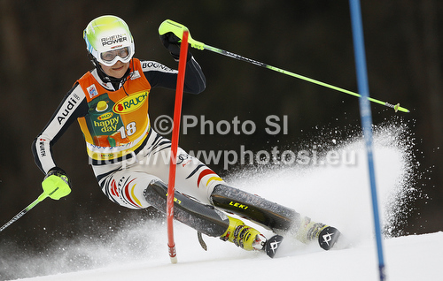 : Fanny Chmelar of Germany skiing in first run of women slalom race of Audi FIS Alpine skiing World cup in Kranjska Gora, Slovenia. Traditional Golden fox trophy women slalom race of Audi FIS Alpine skiing World cup, which was scheduled to be run in Maribor, Slovenia, was moved to Kranjska Gora, Slovenia, due warm weather and lack of snow in Maribor, and was held in Kranjska Gora, Slovenia, on Sunday, 22nd of January 2012.