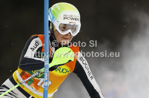 : Fanny Chmelar of Germany skiing in first run of women slalom race of Audi FIS Alpine skiing World cup in Kranjska Gora, Slovenia. Traditional Golden fox trophy women slalom race of Audi FIS Alpine skiing World cup, which was scheduled to be run in Maribor, Slovenia, was moved to Kranjska Gora, Slovenia, due warm weather and lack of snow in Maribor, and was held in Kranjska Gora, Slovenia, on Sunday, 22nd of January 2012.