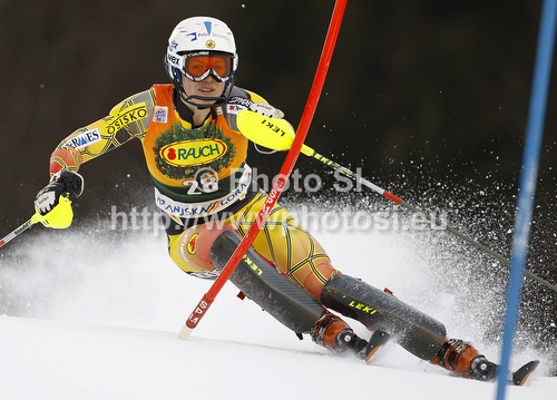 Kranjska Gora ,Slovenia - 22.01.2012 : Erin Mielzynski of Canada skiing in first run of women slalom race of Audi FIS Alpine skiing World cup in Kranjska Gora, Slovenia. Traditional Golden fox trophy women slalom race of Audi FIS Alpine skiing World cup, which was scheduled to be run in Maribor, Slovenia, was moved to Kranjska Gora, Slovenia, due warm weather and lack of snow in Maribor, and was held in Kranjska Gora, Slovenia, on Sunday, 22nd of January 2012. Photo by: Primoz Jeroncic