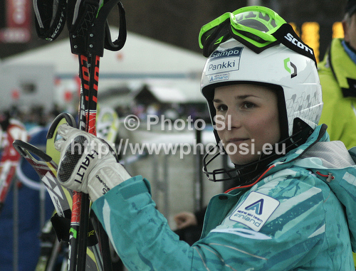 : Merle Soppela of Finland in finish of women slalom race of Audi FIS Alpine skiing World cup in Kranjska Gora, Slovenia. Traditional Golden fox trophy women slalom race of Audi FIS Alpine skiing World cup, which was scheduled to be run in Maribor, Slovenia, was moved to Kranjska Gora, Slovenia, due warm weather and lack of snow in Maribor, and was held in Kranjska Gora, Slovenia, on Sunday, 22nd of January 2012.