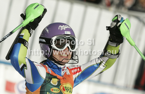 : Fourth placed Tina Maze of Slovenia reacts in finish of second run of women slalom race of Audi FIS Alpine skiing World cup in Kranjska Gora, Slovenia. Traditional Golden fox trophy women slalom race of Audi FIS Alpine skiing World cup, which was scheduled to be run in Maribor, Slovenia, was moved to Kranjska Gora, Slovenia, due warm weather and lack of snow in Maribor, and was held in Kranjska Gora, Slovenia, on Sunday, 22nd of January 2012.