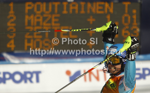 : Second pleced Tanja Poutiainen of Finland reacts in finish of second run of women slalom race of Audi FIS Alpine skiing World cup in Kranjska Gora, Slovenia. Traditional Golden fox trophy women slalom race of Audi FIS Alpine skiing World cup, which was scheduled to be run in Maribor, Slovenia, was moved to Kranjska Gora, Slovenia, due warm weather and lack of snow in Maribor, and was held in Kranjska Gora, Slovenia, on Sunday, 22nd of January 2012.