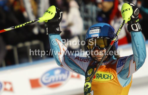 Kranjska Gora ,Slovenia - 22.01.2012 : Second pleced Tanja Poutiainen of Finland reacts in finish of second run of women slalom race of Audi FIS Alpine skiing World cup in Kranjska Gora, Slovenia. Traditional Golden fox trophy women slalom race of Audi FIS Alpine skiing World cup, which was scheduled to be run in Maribor, Slovenia, was moved to Kranjska Gora, Slovenia, due warm weather and lack of snow in Maribor, and was held in Kranjska Gora, Slovenia, on Sunday, 22nd of January 2012. Photo by: Primoz Jeroncic
