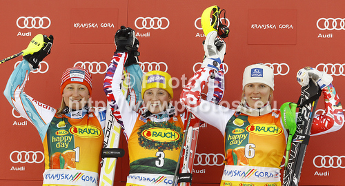: Winner Michaela Kirchgasser of Austria (M), second placed Tanja Poutiainen of Finland (L) and third placed Veronika Zuzulova of Slovakia (R) celebrate their medals won in women slalom race of Audi FIS Alpine skiing World cup in Kranjska Gora, Slovenia. Traditional Golden fox trophy women slalom race of Audi FIS Alpine skiing World cup, which was scheduled to be run in Maribor, Slovenia, was moved to Kranjska Gora, Slovenia, due warm weather and lack of snow in Maribor, and was held in Kranjska Gora, Slovenia, on Sunday, 22nd of January 2012.