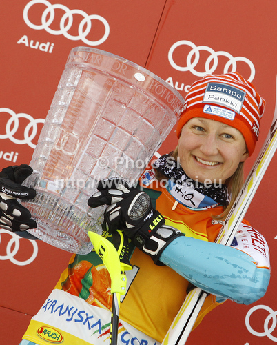 : Golden Fox trophy overall winner Tanja Poutiainen of Finland celebrates her medal won in women slalom race of Audi FIS Alpine skiing World cup in Kranjska Gora, Slovenia. Traditional Golden fox trophy women slalom race of Audi FIS Alpine skiing World cup, which was scheduled to be run in Maribor, Slovenia, was moved to Kranjska Gora, Slovenia, due warm weather and lack of snow in Maribor, and was held in Kranjska Gora, Slovenia, on Sunday, 22nd of January 2012.