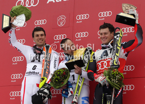 : Winner Cristian Deville of Italy (middle), second placed Mario Matt of Austria and third placed Ivica Kostelic of Croatia (right) celebrate their medals won in the Men Slalom race of Audi FIS alpine skiing World Cup in Kitzbuhel, Austria. Men Slalom race of Men Audi FIS Alpine skiing World Cup 2011 / 2012, was held on Sunday, 22nd of Januar 2012, on Ganslernhang course in Kitzbuhel, Austria.