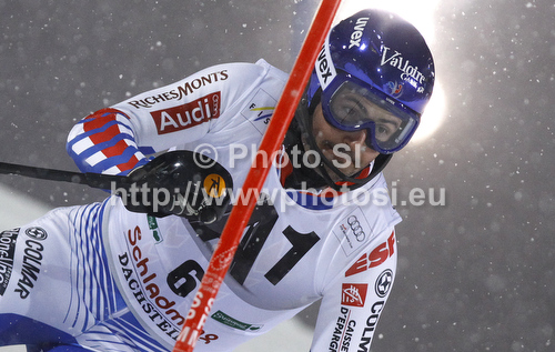 : Jean-Baptiste Grange of France skiing in first run of men slalom race of Audi FIS Alpine skiing World cup in Schladming, Austria. Traditional The Nightrace, men slalom race of Audi FIS Alpine skiing World cup, was held in Schladming, Austria, on Tuesday, 24th of January 2012.