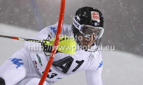 : Stefano Gross of Italy skiing in first run of men slalom race of Audi FIS Alpine skiing World cup in Schladming, Austria. Traditional The Nightrace, men slalom race of Audi FIS Alpine skiing World cup, was held in Schladming, Austria, on Tuesday, 24th of January 2012.