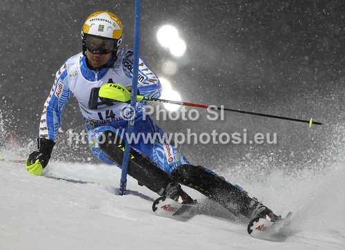 : Mattias Hargin of Sweden skiing in first run of men slalom race of Audi FIS Alpine skiing World cup in Schladming, Austria. Traditional The Nightrace, men slalom race of Audi FIS Alpine skiing World cup, was held in Schladming, Austria, on Tuesday, 24th of January 2012.