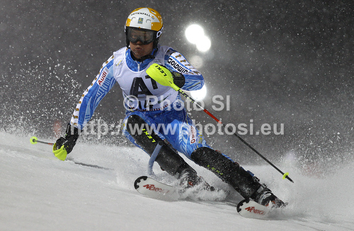: Mattias Hargin of Sweden skiing in first run of men slalom race of Audi FIS Alpine skiing World cup in Schladming, Austria. Traditional The Nightrace, men slalom race of Audi FIS Alpine skiing World cup, was held in Schladming, Austria, on Tuesday, 24th of January 2012.