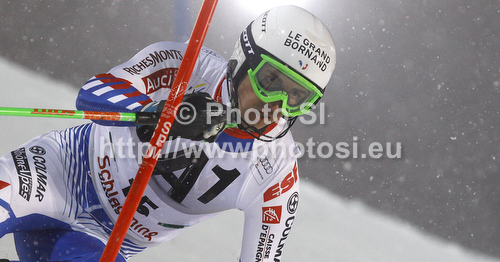 : Steve Missillier of France skiing in first run of men slalom race of Audi FIS Alpine skiing World cup in Schladming, Austria. Traditional The Nightrace, men slalom race of Audi FIS Alpine skiing World cup, was held in Schladming, Austria, on Tuesday, 24th of January 2012.