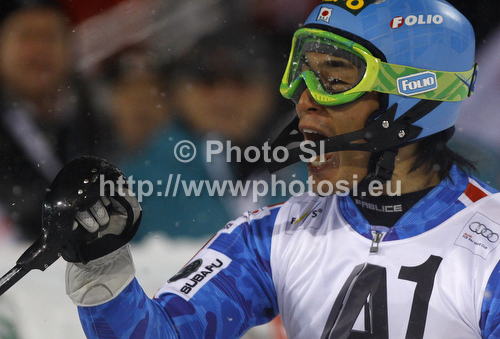 : Fifth placed Naoki Yuasa of Japan reacts in finish of second run of men slalom race of Audi FIS Alpine skiing World cup in Schladming, Austria. Traditional The Nightrace, men slalom race of Audi FIS Alpine skiing World cup, was held in Schladming, Austria, on Tuesday, 24th of January 2012.