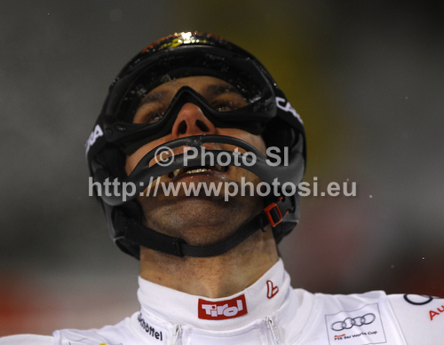 : Third placed Mario Matt of Austria reacts in finish of second run of men slalom race of Audi FIS Alpine skiing World cup in Schladming, Austria. Traditional The Nightrace, men slalom race of Audi FIS Alpine skiing World cup, was held in Schladming, Austria, on Tuesday, 24th of January 2012.
