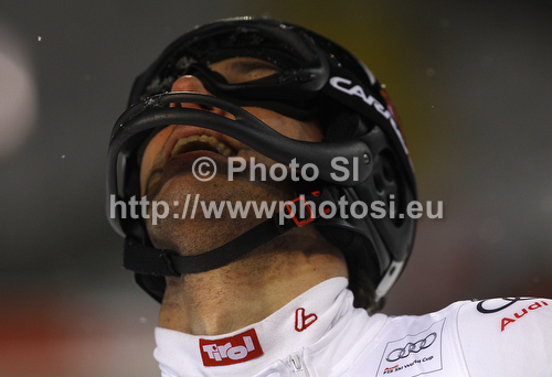 : Third placed Mario Matt of Austria reacts in finish of second run of men slalom race of Audi FIS Alpine skiing World cup in Schladming, Austria. Traditional The Nightrace, men slalom race of Audi FIS Alpine skiing World cup, was held in Schladming, Austria, on Tuesday, 24th of January 2012.