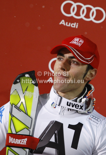 Schladming ,Austria - 24.01.2012 : Second placed Stefano Gross of Italy celebrates his medal won in men slalom race of Audi FIS Alpine skiing World cup in Schladming, Austria. Traditional The Nightrace, men slalom race of Audi FIS Alpine skiing World cup, was held in Schladming, Austria, on Tuesday, 24th of January 2012. Photo by: Primoz Jeroncic