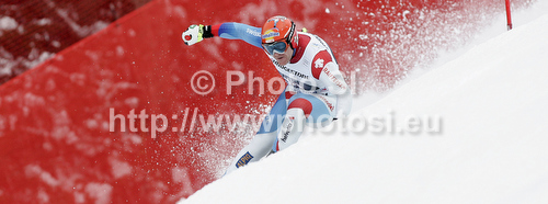 : Didier Cuche of Switzerland skiing in training run for men downhill race of Audi FIS Alpine skiing World cup in Garmisch-Partenkirchen, Germany. Training for men downhill race of Audi FIS Alpine skiing World cup, was held in Garmisch-Partenkirchen, Germany, on Friday, 27th of January 2012.