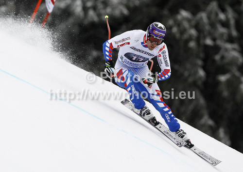 : Adrien Theaux of France skiing in men downhill race of Audi FIS Alpine skiing World cup in Garmisch-Partenkirchen, Germany. Men downhill race of Audi FIS Alpine skiing World cup, was held in Garmisch-Partenkirchen, Germany, on Saturday, 28th of January 2012.