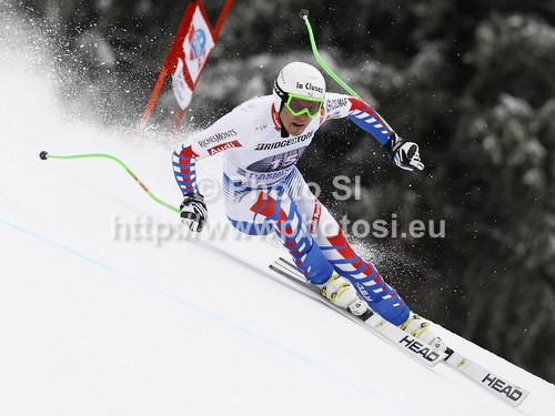 : Joham Clarey of France skiing in men downhill race of Audi FIS Alpine skiing World cup in Garmisch-Partenkirchen, Germany. Men downhill race of Audi FIS Alpine skiing World cup, was held in Garmisch-Partenkirchen, Germany, on Saturday, 28th of January 2012.
