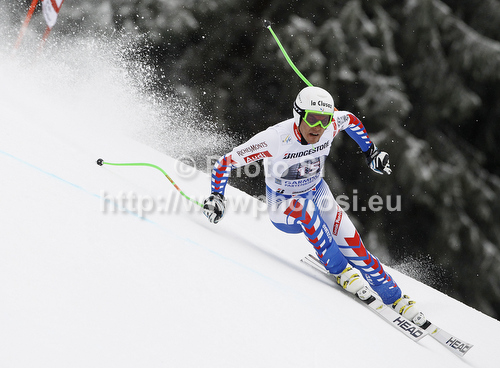 : Joham Clarey of France skiing in men downhill race of Audi FIS Alpine skiing World cup in Garmisch-Partenkirchen, Germany. Men downhill race of Audi FIS Alpine skiing World cup, was held in Garmisch-Partenkirchen, Germany, on Saturday, 28th of January 2012.