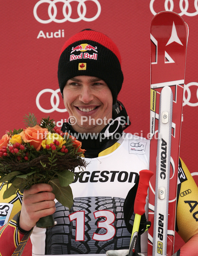 : Second placed Erik Guay of Canada celebrates his medal won in men downhill race of Audi FIS Alpine skiing World cup in Garmisch-Partenkirchen, Germany. Men downhill race of Audi FIS Alpine skiing World cup, was held in Garmisch-Partenkirchen, Germany, on Saturday, 28th of January 2012.