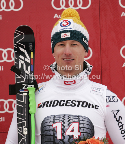 : Third placed Hannes Reichelt of Austria celebrates his medal won in men downhill race of Audi FIS Alpine skiing World cup in Garmisch-Partenkirchen, Germany. Men downhill race of Audi FIS Alpine skiing World cup, was held in Garmisch-Partenkirchen, Germany, on Saturday, 28th of January 2012.