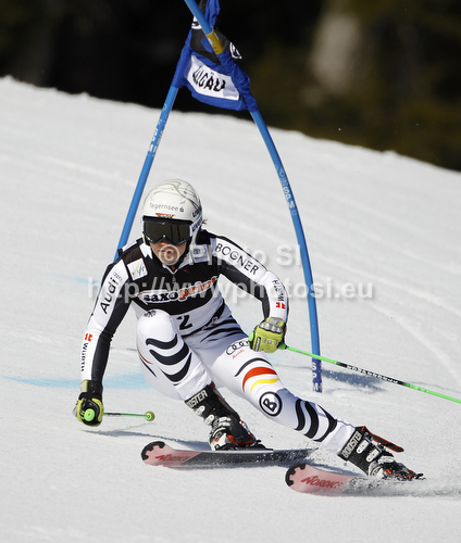 : Viktoria Rebensburg of Germany skiing in first run of women giant slalom race of Audi FIS Alpine skiing World cup in Ofterschwang, Germany. Women giant slalom race of Audi FIS Alpine skiing World cup, which replaced canceled race of Soldeau, Andora, was held in Ofterschwang, Germany, on Friday, 2nd of March 2012.