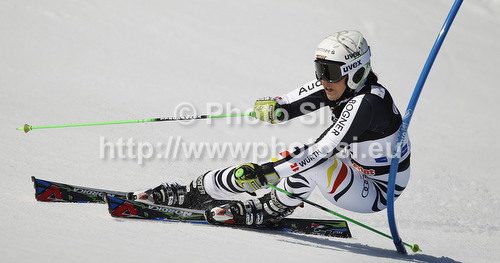 : Viktoria Rebensburg of Germany skiing in first run of women giant slalom race of Audi FIS Alpine skiing World cup in Ofterschwang, Germany. Women giant slalom race of Audi FIS Alpine skiing World cup, which replaced canceled race of Soldeau, Andora, was held in Ofterschwang, Germany, on Friday, 2nd of March 2012.