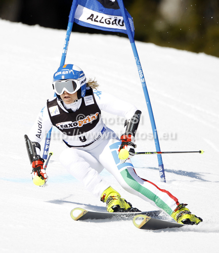 : Denise Karbon of Italy skiing in first run of women giant slalom race of Audi FIS Alpine skiing World cup in Ofterschwang, Germany. Women giant slalom race of Audi FIS Alpine skiing World cup, which replaced canceled race of Soldeau, Andora, was held in Ofterschwang, Germany, on Friday, 2nd of March 2012.