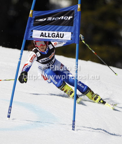: Marion Bertrand of France skiing in first run of women giant slalom race of Audi FIS Alpine skiing World cup in Ofterschwang, Germany. Women giant slalom race of Audi FIS Alpine skiing World cup, which replaced canceled race of Soldeau, Andora, was held in Ofterschwang, Germany, on Friday, 2nd of March 2012.