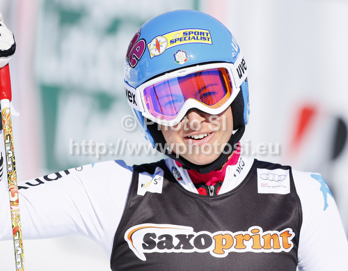 : Third placed Irene Curtoni of Italy reacts in finish of second run of women giant slalom race of Audi FIS Alpine skiing World cup in Ofterschwang, Germany. Women giant slalom race of Audi FIS Alpine skiing World cup, which replaced canceled race of Soldeau, Andora, was held in Ofterschwang, Germany, on Friday, 2nd of March 2012.