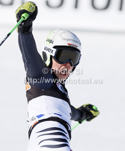 : Winner Viktoria Rebensburg of Germany reacts in finish of second run of women giant slalom race of Audi FIS Alpine skiing World cup in Ofterschwang, Germany. Women giant slalom race of Audi FIS Alpine skiing World cup, which replaced canceled race of Soldeau, Andora, was held in Ofterschwang, Germany, on Friday, 2nd of March 2012.