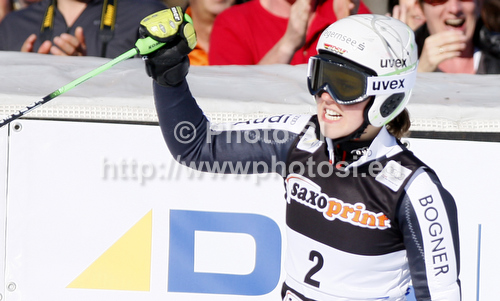 : Winner Viktoria Rebensburg of Germany reacts in finish of second run of women giant slalom race of Audi FIS Alpine skiing World cup in Ofterschwang, Germany. Women giant slalom race of Audi FIS Alpine skiing World cup, which replaced canceled race of Soldeau, Andora, was held in Ofterschwang, Germany, on Friday, 2nd of March 2012.