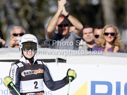: Winner Viktoria Rebensburg of Germany reacts in finish of second run of women giant slalom race of Audi FIS Alpine skiing World cup in Ofterschwang, Germany. Women giant slalom race of Audi FIS Alpine skiing World cup, which replaced canceled race of Soldeau, Andora, was held in Ofterschwang, Germany, on Friday, 2nd of March 2012.