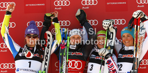 : Winner Viktoria Rebensburg of Germany (M), second placed Tina Maze of Slovenia (L) and third placed Elisabeth Goergl of Austria (2nd from R) and Irene Curtoni of Italy (R) celebrate their medals won in women giant slalom race of Audi FIS Alpine skiing World cup in Ofterschwang, Germany. Women giant slalom race of Audi FIS Alpine skiing World cup, which replaced canceled race of Soldeau, Andora, was held in Ofterschwang, Germany, on Friday, 2nd of March 2012.