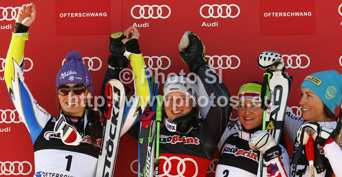 : Winner Viktoria Rebensburg of Germany (M), second placed Tina Maze of Slovenia (L) and third placed Elisabeth Goergl of Austria (2nd from R) and Irene Curtoni of Italy (R) celebrate their medals won in women giant slalom race of Audi FIS Alpine skiing World cup in Ofterschwang, Germany. Women giant slalom race of Audi FIS Alpine skiing World cup, which replaced canceled race of Soldeau, Andora, was held in Ofterschwang, Germany, on Friday, 2nd of March 2012.