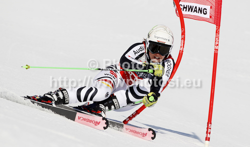 : Viktoria Rebensburg of Germany skiing in first run of women giant slalom race of Audi FIS Alpine skiing World cup in Ofterschwang, Germany. Women giant slalom race of Audi FIS Alpine skiing World cup was held in Ofterschwang, Germany, on Saturday, 3rd of March 2012.
