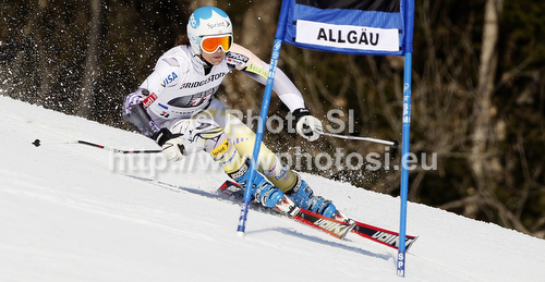 : Julia Mancuso of USA skiing in first run of women giant slalom race of Audi FIS Alpine skiing World cup in Ofterschwang, Germany. Women giant slalom race of Audi FIS Alpine skiing World cup was held in Ofterschwang, Germany, on Saturday, 3rd of March 2012.
