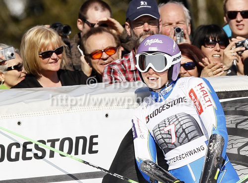 : Third placed Tina Maze of Slovenia reacts in finish of second run of women giant slalom race of Audi FIS Alpine skiing World cup in Ofterschwang, Germany. Women giant slalom race of Audi FIS Alpine skiing World cup was held in Ofterschwang, Germany, on Saturday, 3rd of March 2012.