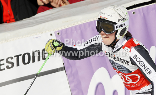 : Winner Viktoria Rebensburg of Germany reacts in finish of second run of women giant slalom race of Audi FIS Alpine skiing World cup in Ofterschwang, Germany. Women giant slalom race of Audi FIS Alpine skiing World cup was held in Ofterschwang, Germany, on Saturday, 3rd of March 2012.
