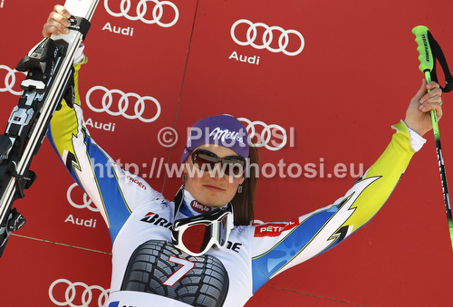 : Third placed Tina Maze of Slovenia celebrates her medal won in women giant slalom race of Audi FIS Alpine skiing World cup in Ofterschwang, Germany. Women giant slalom race of Audi FIS Alpine skiing World cup was held in Ofterschwang, Germany, on Saturday, 3rd of March 2012.