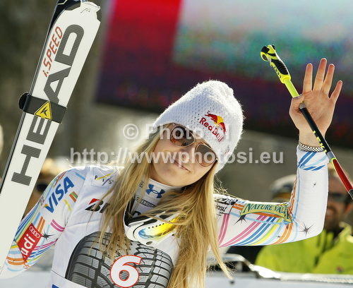 : Second placed Lindsey Vonn of USA celebrates her medal won in women giant slalom race of Audi FIS Alpine skiing World cup in Ofterschwang, Germany. Women giant slalom race of Audi FIS Alpine skiing World cup was held in Ofterschwang, Germany, on Saturday, 3rd of March 2012.