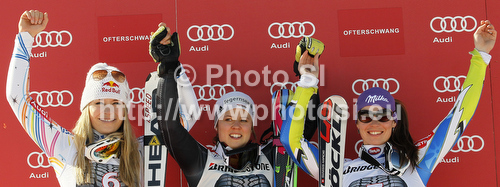 : Winner Viktoria Rebensburg of Germany (M), second placed Lindsey Vonn of USA (L) and third placed Tina Maze of Slovenia (R) celebrate their medals won in women giant slalom race of Audi FIS Alpine skiing World cup in Ofterschwang, Germany. Women giant slalom race of Audi FIS Alpine skiing World cup was held in Ofterschwang, Germany, on Saturday, 3rd of March 2012.