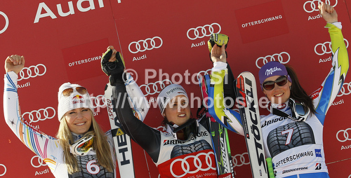 : Winner Viktoria Rebensburg of Germany (M), second placed Lindsey Vonn of USA (L) and third placed Tina Maze of Slovenia (R) celebrate their medals won in women giant slalom race of Audi FIS Alpine skiing World cup in Ofterschwang, Germany. Women giant slalom race of Audi FIS Alpine skiing World cup was held in Ofterschwang, Germany, on Saturday, 3rd of March 2012.
