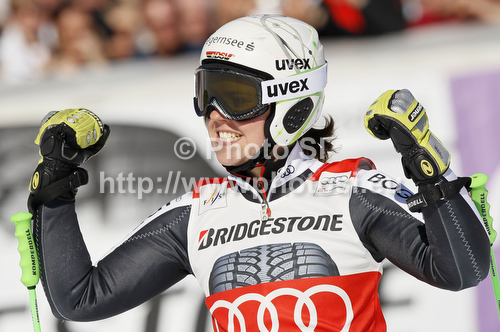 : Winner Viktoria Rebensburg of Germany reacts in finish of second run of women giant slalom race of Audi FIS Alpine skiing World cup in Ofterschwang, Germany. Women giant slalom race of Audi FIS Alpine skiing World cup was held in Ofterschwang, Germany, on Saturday, 3rd of March 2012.