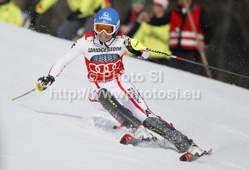 : Marlies Schild of Austria skiing in first run of women slalom race of Audi FIS Alpine skiing World cup in Ofterschwang, Germany. Women slalom race of Audi FIS Alpine skiing World cup was held in Ofterschwang, Germany, on Sunday, 4th of March 2012.